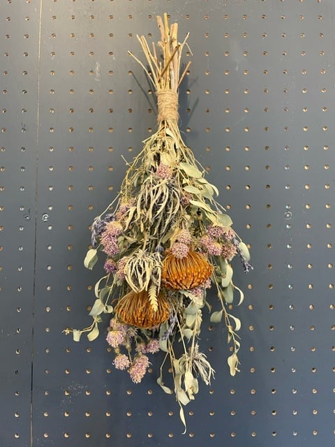 染色、脱色をしていない天然素材のナチュラルドライフラワースワッグ。ひとつひとつ手作りしています。オレンジ色のドライアンドラ・フォルモーサがおしゃれです。